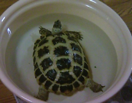 はやいもので12月になってもう5日経ちました。実はキキが逝ってしまった次の日に決まりかけていた家が駄目になりました~もうこうなったらあせってもしょうがない・・・って感じです。まあ、下のお二人さんみたくのんびり行くことにしましたゆきお達のお風呂が壊れてきたので新しい物に変えました・・・が(ちょっと小さい!!)ゆきお君・・今年はこれで我慢してね~ターナは気持ちよいのか思いっきり伸びてます。朝風呂の後はお食事タイムです。去年は失敗してしまってゆきおとターナを半冬眠状態にさせてしまいました今年は水槽をストーブの近くに置いたので朝から食欲旺盛なお二人さんです。食べるのはいいのですが・・・これ以上大きくなったらちょっと大変かも・・・ご心配お掛けしましたがタバサが少しずつ元気になってきました。一時期は体重の減少が激しかったのですがキキが居なくてもご飯を食べるようになってきて体重も安定してきました。でも・・・時々、キキの鳴き声を真似ているのを聞くと切なくなりますタバサ・・お母さんと一緒に頑張ろうね