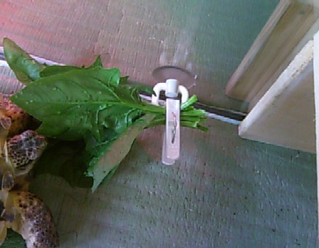 最近ゆきおとターナが大きくなってきてご飯の入れ物をひっくり返してしまいますなにか良い方法は無いかと常々思ってました~今日、買い物の帰りに100円ショップで有るものを見ていてひらめいたのです!早速ゆきお達の水槽に設置しました。名前はなんて言うか分かりませんがゴムの吸盤の先がわっかになっていて野菜を乗せるに好都合なのです!あとは洗濯バサミで野菜を留めればOKです。なんか自然に草が生えているようにみえませんか?ゆきお達の反応は・・・野菜好きのゆきおは何のためらいも無くかぶりついてます。この後、ゆきおは3回もおかわりをしました~普段、野菜を食べないターナもご覧の通りです水槽の掃除も今までに比べて楽になるし何より、ターナがこの調子で野菜を食べてくれれば言う事無しです