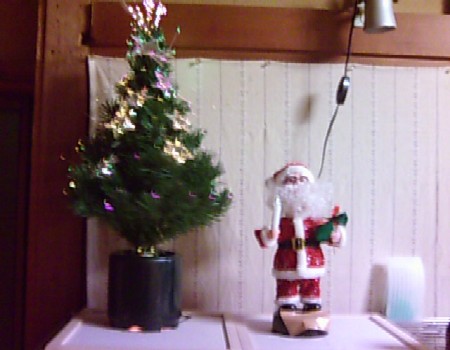 クリスマスまで後3日で~す我が家もやっとクリスマスの飾りつけが出来ました。クリスマスツリーとサンタさんです。このサンタさん後ろのスイッチを押すとクリスマスソングを奏でながら踊るのですが・・・その音が何とも大きい解決法としては足元の音が出るところにガムテープを貼ると音が小さくなります(もっと洒落たテープを貼るべきだった)つまり、不良品で売れ残ったサンタさんでした~(なのでとっても格安でしたのです)そして、どう言う訳かメガネをかけてますメガネの替えもちゃんと付いているんですよ~なんとも愛嬌のあるサンタさんで一目で気に入ってしまいました鳥ラックにも飾り付けしました。タバサにはシャベルサンタさんサラにはハートのサンタさんそしてゆきお達には・・・ゴールドラッパ・・・なんの意味があるんだろう??タバサとサラはおおはしゃぎなのですがゆきおとターナは無関心ですぅもっともラッパでは意味不明なのでしょうかね