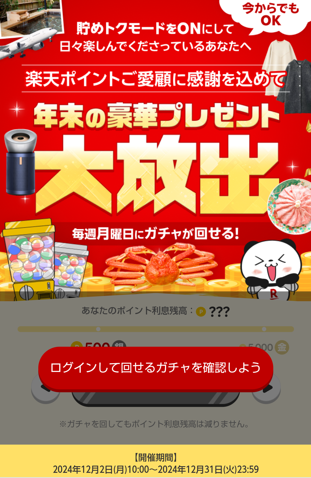 【楽天PointClub】楽天ポイント利息|毎週月曜にガチャが回せる!年末の豪華プレゼント大放出「貯めトク!ガチャ」