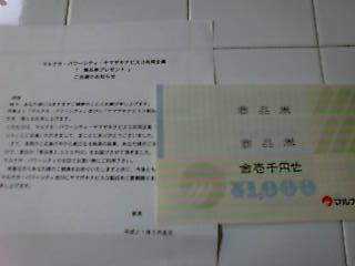 【2009年5月当選品】1.1日 コカ・コーラ ジェフグルメカード5000円分2.1日 赤ちゃん本舗×貝印 ハンドミキサー3.2日 ネスレピュリナ キャットフード4.2日 おんまく寿司 お食事券1000円分5.3日 ジャスコ×明治製菓 ポケモンレジャーセット6.8日 buzzLife アサヒ スリムアップスリム1箱+10袋7.8日 三井製糖 ル・クルーゼ ラムカンダムール2個8.10日 イトーヨーカー堂西日本×キッコーマン 野菜苗セット9.10日 イトーヨーカー堂西日本×キッコーマン 野菜苗セット10.14日 buzzLife JCBギフトカード1000円分11.15日 ジャスコ×明治製菓 ポケモンお勉強セット12.15日 レデイ薬局×ヒガシマル・明治製菓など ミュージカル親子ペア招待券13.15日 レデイ薬局×ヒガシマル・明治製菓など ミュージカル親子ペア招待券14.16日 マルナカ×花王 ポット型浄水器15.21日 フジ×南海放送 商品券1000円分16.28日 マルナカ×ヤマザキナビスコ 商品券2000円分17.28日 マルナカ×ヤマザキナビスコ 商品券2000円分18.29日 マルヨシセンター×ロッテアイス ROOKIES映画ペアチケット19.29日 マルヨシセンター×ロッテアイス ROOKIES映画ペアチケット20.29日 マルナカ×花王 W賞 ハンドソープ+洗剤その他3日 ネスレピュリナ キャットフード1kg(先着プレ)27日 カルカン おもちゃ+キャットフード(先着プレ)5月応募数125枚5月当選数20個5月当選金額53800円5月金券類合計12000円