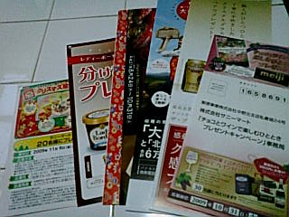 タイアップ・フジ×カルピス(オリジナル絵本・朝顔グラスが当たるハガキ)10/31〆レシ・フジ×森永製菓(商品券が当たるハガキ)10/19必着〆レシ・イオン、ダイエー×キリン(イオンギフトカード・ダイエー商品券が当たるハガキ)10/23〆レシ(レシート有効10/18まで)・イオン(ジャスコ・スーパーセンター)×キリン・ニッポンハム(サッカー教室・日帰りペア昼食券・お料理教室・商品券などが当たるハガキ)11/4〆レシ(レシート有効10/31まで)・イオン×サントリー金麦(ホテル宿泊&ディナーがペアで当たるハガキ)10/20〆レシ・イオン×サントリー(ホームベーカリー・IHホットプレート・スチームオーブンレンジ・選べるグルメギフト券が当たるハガキ)11/30〆レシ全国版・パスコ(リサとガスパールのピクニックセットが当たるハガキ)12/5〆シール・UCC(エコグッズが当たるハガキ)1回目12/31、2回目2/28〆マーク・サントリー角瓶(四国限定)(グルメカタログが当たるハガキ)11/9〆シール・マルキン(現金5000円・3000円が当たるハガキ)1回目10/31、2回目11/30〆バーコ・ピエトロ(素敵な景品・現金1万円が当たるハガキ)1回目2010年2月、最終2011年3月〆マーク・いなばペットフード(JCBギフト券・オリジナルケトル・ペットフードが当たるハガキ)2010年1/31〆シール