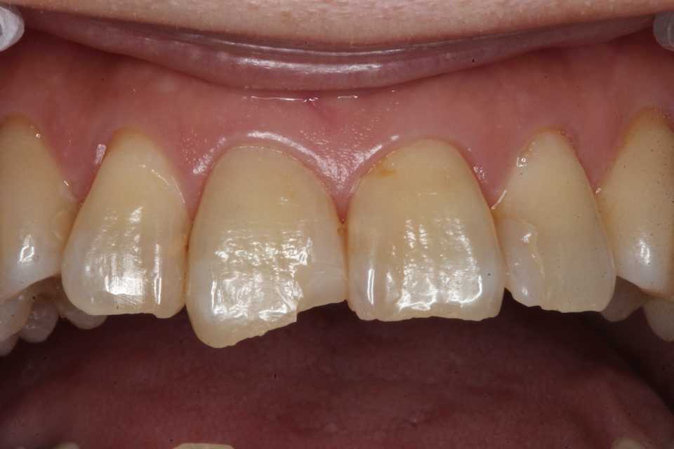 40代女性、右上1、咬合性切縁破折前歯の先端はCRではつい硬いものを噛むと欠けやすいのだが、これが最も歯には優しい。見かけもよくしてね、ということで切縁の長さを揃えた。beforeafter