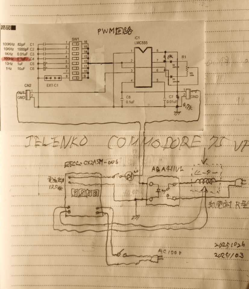 懸念していたとおり、900℃付近で断線してしまった。やはりAC100Vに直結していたので温度上昇が速すぎたのだと思う。めんどくさがらずにPWM制御にすればよかった。。PWM回路はステッピングモーター駆動用に使っていた秋月電子のLMC555の発振器キットを改造して作った。これをオムロンの温度制御器とパナソニックのSSR(AQA411VL)の間に入れるだけ。約120Hzで発振していたので非同期でそのまま使った。もう少し高い周波数でスイッチングさせた方が綺麗に制御できるとは思うのだが、SSRの入力信号の周波数に関する情報が入手できなかったので、このまま行こうかと思う。実験してみれば分かると思うが。全回路図電球の明るさを制御してみた1番暗い、絞り切ったところだんだん明るくなってこれが半分の電力どんどん明るくなるもう眩しくて目がやられるこれが最大気になったので周波数を変えて実験してみた。電球に掛かる電圧を見ている。AC100Vは280Vp-pになる。SSRは高いスイッチング周波数も受け付けるようだ。60Hzだと不連続半波整流波形で、ヒーターに優しくなさそうだったので、パス。1200Hzも1波抜かしの半波整流になる。また小さい領域にするとパルスが細すぎて制御できない、全OFFになるのでパス。で結局120Hzスイッチングに落ち着いた。絞り切ったところから。絞り切ると60Hz(商用電源周波数)は半波しかひっかからない。トーンバースト波の方がヒーターに優しそう(?)MAX