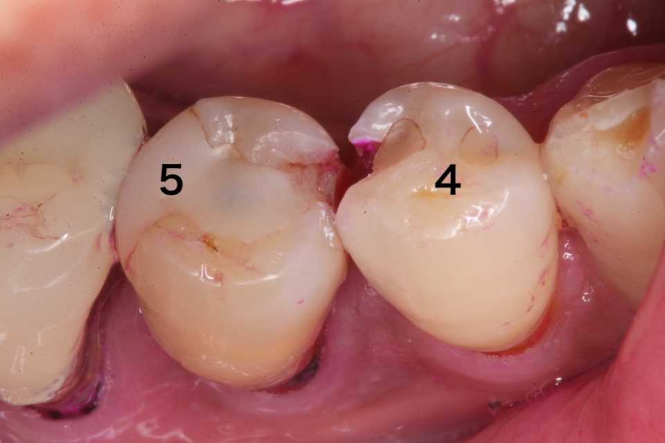 40代男性、右下45、隣接面カリエス、自発痛-、外傷性咬合この方、歯ぎしり等の外傷性咬合があるように見えるが、ご本人は危機感が乏しいようで、ナイトガードも忘れているそうです。外傷性に隣接面や歯茎部に微小クラックが入り虫歯になる。砂糖クリーム入りコーヒー等の頻回摂取等があれば隣接面カリエスは急速進行してしまう。『CR(コンポジットレジン)』では検索に引っかからないそうなので、今日から『ダイレクトボンディング』という検索ワードを付けることにしました。ま、同じことです。長いから嫌なんだけれど。右下5の遠心のCRはコロナ騒ぎが始まる前の2019年の処置で、6年以上経過しているのですが、摩耗することもなく、2次カリエスになることもなく良好に経過していることがわかります。最近のCRやボンディング材の性能は十分ですので、外傷性咬合があっても問題なく長期使用にも耐えることがわかると思う。今日は処置上の具体的な手技に関してもコメントしておきます。ここも参照してください。では時系列でどうぞ歯髄に近い部分には軟化象牙質があるが、露髄するまで除去する必要はない。虫歯は細菌感染症ではなく金属腐食と同じハイドロキシアパタイトの電気的腐食で、α-TCPで軟化象牙質は再硬化するからだ。2次象牙質が見えている(色の濃い部分)。窩洞の周辺部だけは幅1mm以上新鮮歯質を確保しないとボンディング材の性能を生かせない。それより内側は軟化象牙質があってもα-TCPで再硬化する。α-TCPで完全に覆う必要もない。α-TCPは軟化象牙質中を泳動して行きながらハイドロキシアパタイトに変化するようだ。要するに虫歯は治る。外傷性咬合が長年続いているので、2次象牙質が分厚くなって切削時に痛みを感じない。麻酔は使わず、軟化象牙質は痛みを感じないが、健全象牙質は痛みを感じることを利用して、どこまで削除して良いか判断するのだが、痛みを感じないと逆にどこまで削って良いか判断が難しい。一々スプーンエキスカベータで触りながらの処置なので時間がかかる。3MIX+α-TCP1次CR、マージンを過不足なく覆う。フロアラブル系のCRの表面張力とぬれの間の微妙な相互作用を利用する。慣れればストリップス(マトリックス、隔壁)は不要だ。この数年ストリップスは使わなくなった。フロアラブルレジンは押し出すだけで使い、チップ先端で塗り広げようと思ってはならない。はみ出たCRは細い探針を歯面にそわせてかき上げると良い。隣接面のCRは十分狭い接触面積だとエキスカベータでこじると剥がれる。鎌型スケーラーでバリを取って、デンタルフロスも通ることを確認して、バイトを確認して終わる。