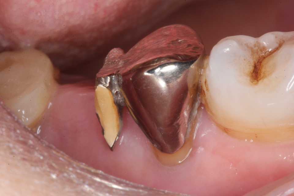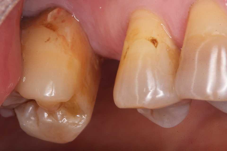 50代女性、左上5-7ブリッジ脱離、7番2次カリエス+Per(根尖性歯周炎)、強度の外傷性咬合前回のつづきhttps://plaza.rakuten.co.jp/mabo400dc/diary/202510310000/2週間ほどして、3MIXが効いたようで動揺が止まった。そのままCRで咬合を回復してさらに1週間後、経過は良いようなのでブリッジ等を再装着する治療に取り掛かった。まず既存の5番のFCKを外してCR(ダイレクトボンディング)で歯冠修復した。CRで口腔内で歯冠修復などできるのか?と大方の歯医者は思うかもしれないが、慣れればそれほど難しくはないし、強度的にもそれほど問題はない、欠ければそこだけ修復すれば良いのだから、むしろ問題が発見しやすいと考えれば良い。クラウンはセメントが脱離していても表面からは見えないので気が付かずに内部が虫歯になってしまうことも多い。患者サイドからすれば、CR(ダイレクトボンディング)で歯冠修復ができない言い訳を延々とする歯医者はぶきっちょさんだと思っても良い。一般的には歯医者も知らないのだが、クラウン等のセメントは実は上手くすれば要らないのだ。鋳造クラウンが作られるようになった最初期、セメントがまだ発明されていない時代があって、そのまま歯にクラウンを被せていた。それでも虫歯にならなかった。これはどう言うことかというと、嫌気性の硫酸塩還元細菌だけが侵入できるほどの狭い隙間なら、その細菌の代謝産物の硫化鉄(FeS)でその隙間が埋まり、硫化鉄はハイドロキシアパタイト中のプロトンの伝導を阻害するので虫歯にならないのだ。では時系列でどうぞセメントは効いていない。いくら接着力が強くても時間が経過すれば脱離する。これはアンダーカットがあっては口腔外で作って口腔内にセットすることができないという既存の歯冠修復法が抱える本質的な問題なのだが、みんな完全スルーしている。それどころか、アンダーカットがあっては歯学部での実技試験に通らない。これは口腔外で歯冠修復物を作り口腔内にセットするのがあまりも当然に行われて来たので、口腔内で直接修復物を作る(それが可能だという)発想自体が生まれないと言うことだ。これは一種の洗脳で、やってみればそれほど難しくはない。一方CR(ダイレクトボンディング)ではアンダーカットがあっても良い、というよりむしろアンダーカットがあった方が良い。外力により脱離しにくいのだ。これはCR(ダイレクトボンディング)の長期的安定性の理由でもある。黒い色素は硫化鉄(FeS)で、硫酸塩還元細菌の代謝産物だ。内部には細菌が侵入していることを示している。綺麗にしてCR(ダイレクトボンディング)で修復を始める咬合を確認して次回につづく