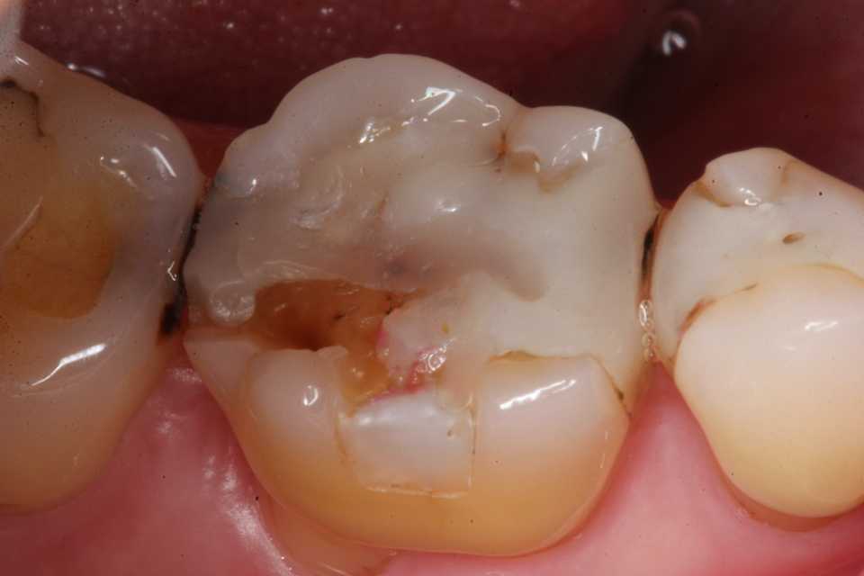 40代女性、右上7、インレー2次カリエスご飯を食べた時に外れたそうだが、だいぶ前から外れかかっていたようだ。内部の覆罩セメントの下はひどい虫歯だった。これでも神経はあるので、少しは知覚がある。軟化象牙質(虫歯)はα-TCPで再硬化するので、執拗に露髄してまでも全部取る必要はない。少し弾力を感じるくらいなら残しても大丈夫だ。通常は神経を取ってクラウンを被せるしかないような症例でもCR(ダイレクトボンディング)で修復可能だ。では時系列でどうぞペラペラのエナメル質しか残っていないが修復は可能だ。外傷性咬合の持ち主にはツライものがあるが。3MIX+α-TCPで全ての軟化象牙質を覆う必要もない。α-TCPは歯質内を泳動して硬化するようだ。1次CR、フニシングラインを過不足なく覆う。この過程が漏洩を防ぐために重要だ。