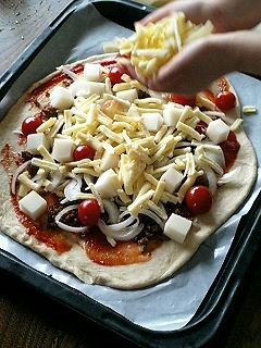 写真は最後にチーズをのせているところ。 多すぎるって!! (笑