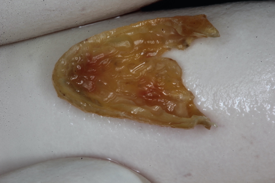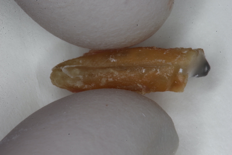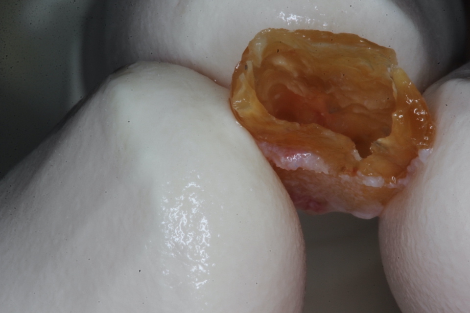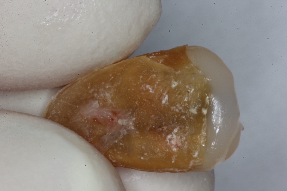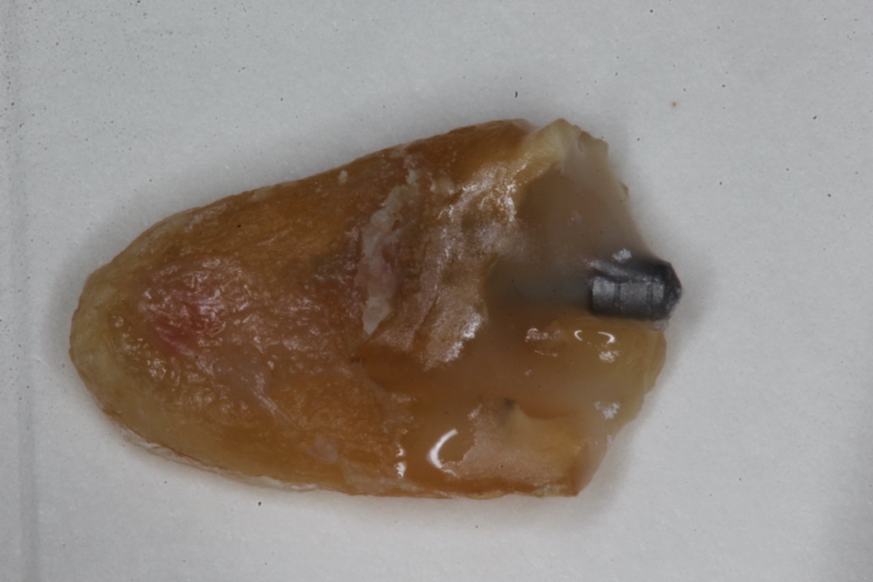 根管充填材と歯質との間には隙間が存在し、細菌の代謝産物の黒色物質のFeSで覆われている。緊密な充填など絵に描いた餅にすぎない。