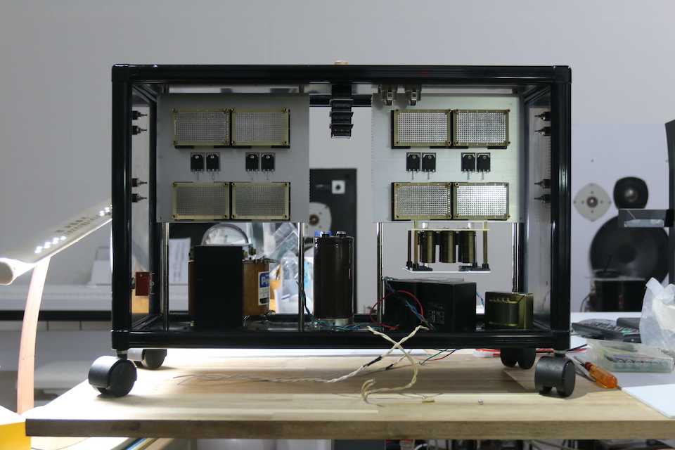 フレーム構造体ができたので、電源と保護回路から配線作業に入る予定。スピーカードライブ部分の定電流駆動(CCD)回路は予備実験をしたが、CCD回路のドライバーはまだ設計ができていない。