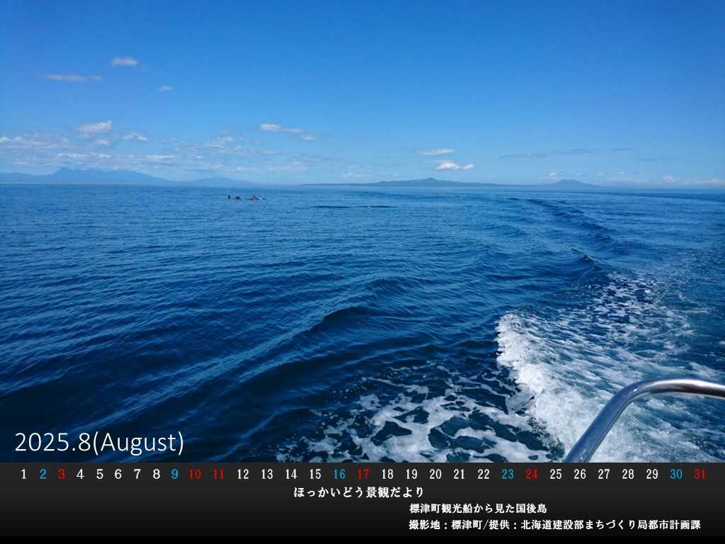 北海道建設部まちづくり局都市計画課です。都市計画課では、北海道の美しい景観をPRするデスクトップ景観カレンダーを配布しています。魅力的な写真をご覧ください! 8月は、標津町の「標津町観光船から見た国後島」です。 写真提供:北海道建設部まちづくり局都市計画課 標津町は、北海道東部、根室振興局管内標津郡にある町です。人口は約5300人、面積は624.69Km²で漁業と酪農が有名な町で、令和2年6月に文化庁から日本遺産として「鮭の聖地」と認定された偉大な町でもあります。 標津町には、サーモンの科学館(鮭の水族館)や国指定史跡である遺跡があるなど豊富な観光スポットもあり、楽しむことができます。なんといっても鮭料理が有名で、中でも醤油や塩水でつけたいくら丼や標津町が発祥とされるチャンチャン焼き、凍ったままで味わう鮭のルイベが最高です。その他、レジャースポットもあり、標津町をたくさん知ることができますので是非訪れてみてください。 カレンダーの写真をよ~く見るとイルカが写っていますので探してみてください。皆さん、ぜひダウンロードして、デスクトップの背景にご利用ください。※下記にURLを載せておきますので、是非ホームページからご覧ください。 https://www.kita-smile.jp/hokkaido_keikan