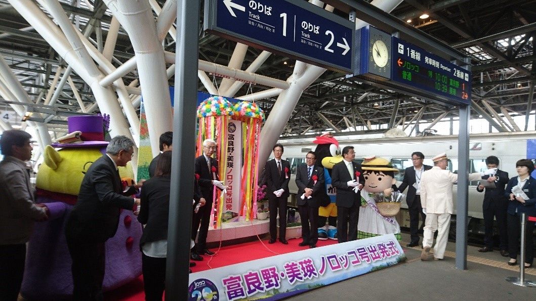 6/9(土)には、JR旭川駅ホームにおいて出発式が行われ、JR富良野線沿線のご当地キャラクター達が出発合図を行い、観光客の皆様をお見送りしましたよ~(^o^)/