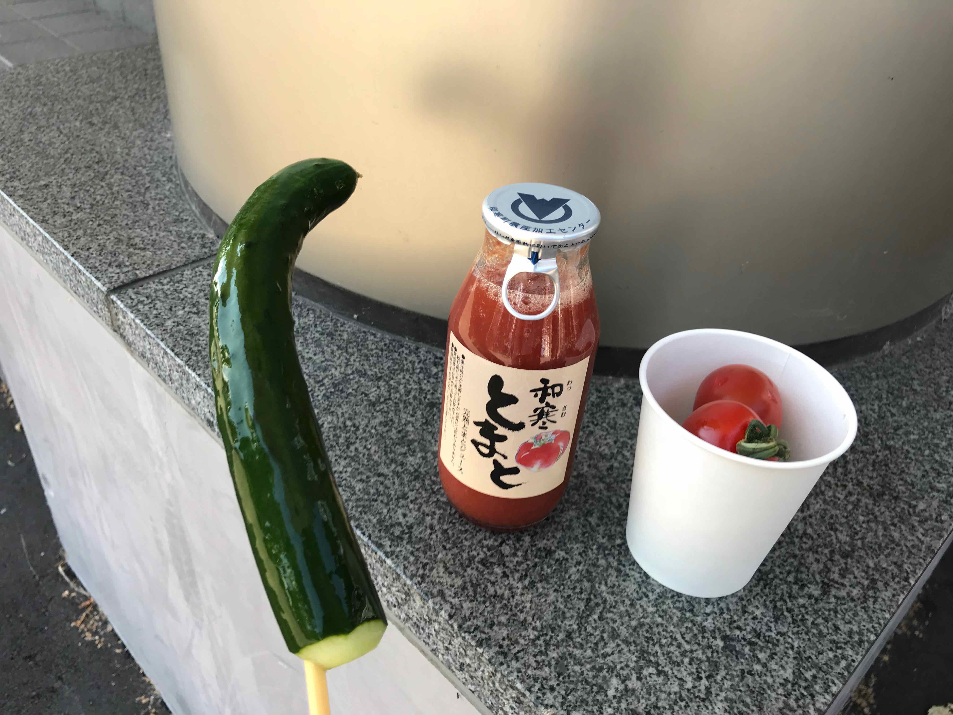 こちらでは、 キュウリの一本付け、ミニトマト、和寒とまとジュース