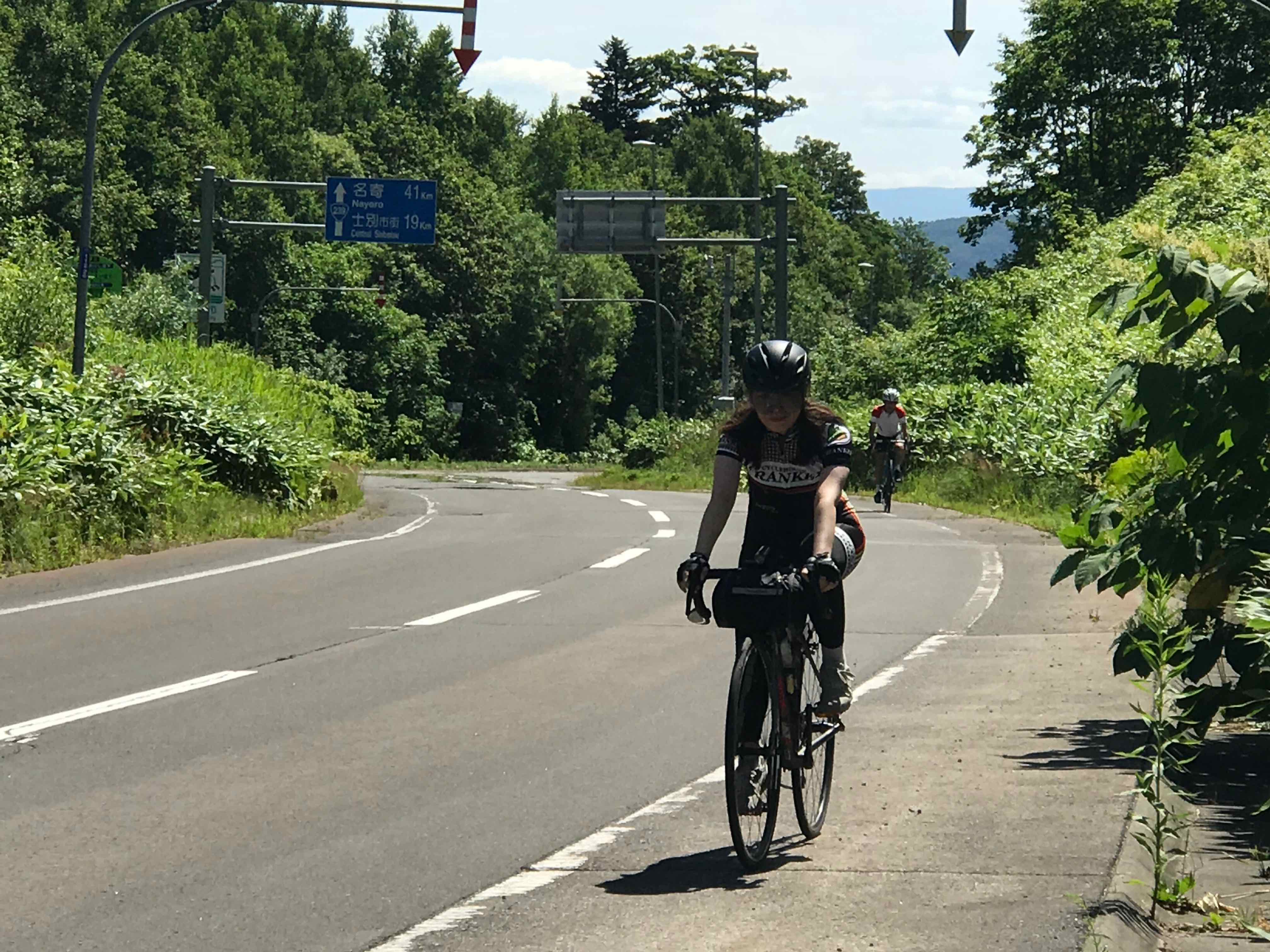 剣淵町を出て士別市に入ると、なかなかの激坂に遭遇。思い出した!昨年もここが一番大変だったんだ。登りが苦手なゆっこママは、みんなに抜かれながらも黙々と登り続けます。坂道は自分のペースで進めばいつかは頂上にたどり着くのですよ、うん。