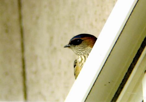 おはようございます。マルさんです。漫画などで描かれている宇宙人はこんな顔ではありませんか?これは「コシアカツバメ」といいます。(友人が私の家で撮った写真)通常のツバメとは違い、なかなか見ることができないといわれていますが、我が家では毎年子育てをしています。今年も1ヶ月ほど前に子育てが終わり、その後見かけなくなりましたが、久々今日(17日)20羽くらいが、我が家の周りを飛び交い、巣穴を覗き込むような様子・・・。その後、南の方角へ飛び去りました。無事を祈るばかりです。