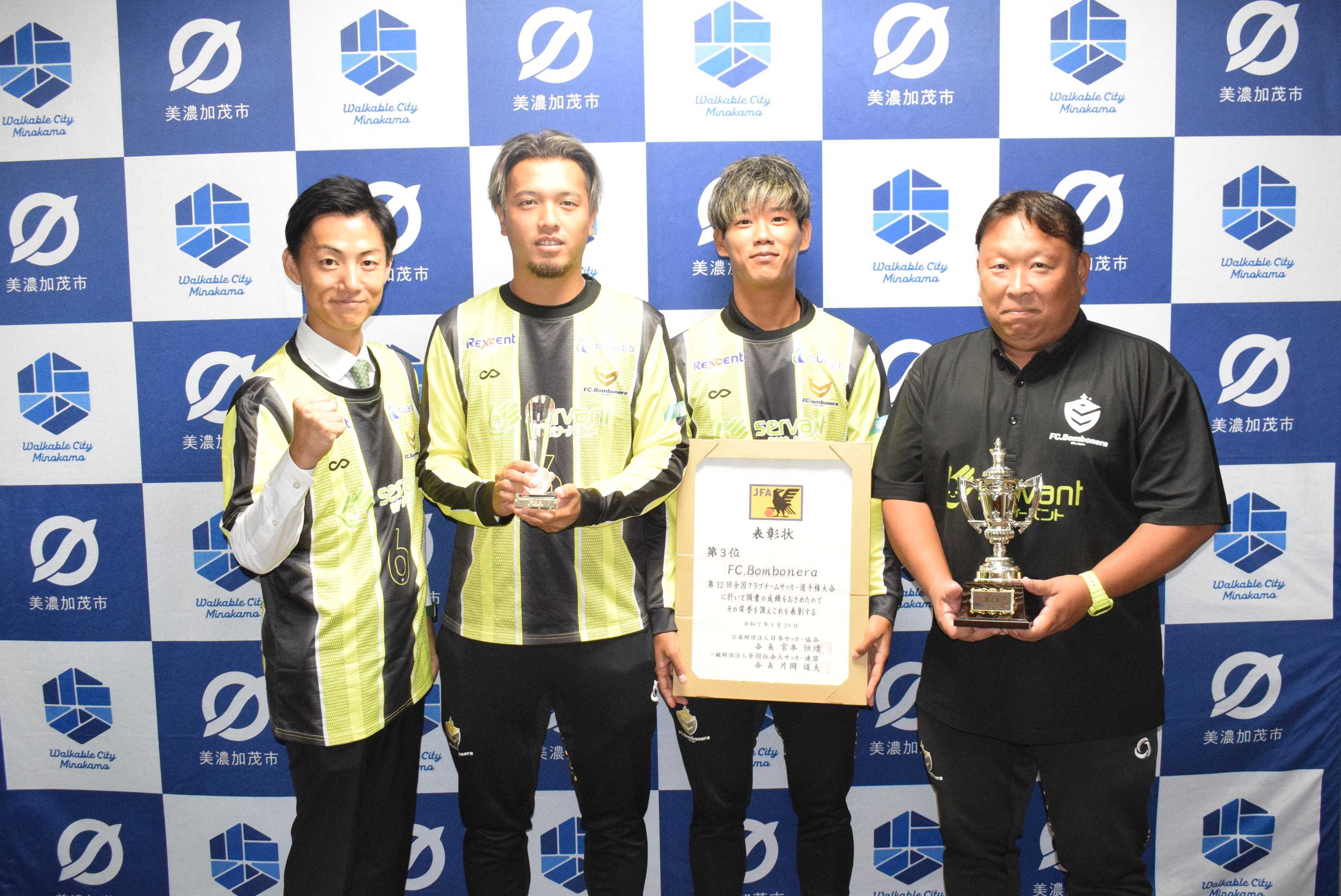 9月26日、美濃加茂市公室に、 社会人サッカーチーム「 」に所属している、三島拓(みしまたく)選手<キャプテン>と池田修志(いけだしゅうじ)選手<美濃加茂市在住>が、9月27日(土)~30日(火)に、福島県の「Jヴィレッジ」で開催された「全国クラブチームサッカー選手権大会」において、全国第3位になったことを報告するために、美濃加茂 市長を表敬訪問されました。
