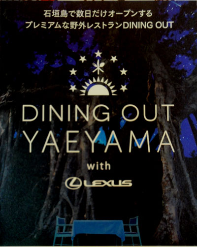 やっぱり今日もいいお天気の石垣島からこんにちはー今日の担当サロンドキミコです。今日のチャンプルーブログは石垣島で数日だけオープンするプレミアムな野外レストランDINING OUT YAEYAMAの話題。毎回日本のどこかで数日だけオープンし世界で注目される料理人と、時代を代表するクリエイターを招きその土地で採れた食材に、新しい感覚を吹き込む料理とその土地の自然や文化を新しい感性で切り取った演出・・・お料理を、味覚だけでなく五感全てで味わえるプレミアムな野外レストラン「DINING OUT」が昨年の第一弾の新潟県佐渡市に続き、今週3月15日からここ石垣島でオープンします!今回は、DINING OUTのみの予約から石垣島での宿泊と往復航空券とDINING OUTがセットになったプランなど、色々なプランがあるそうです。なので、島内の各島々からも、もちろんこのプレミアムなレストランを訪れる方も多いと思いますが新しい空港も開港して県外にお住いの皆さんの地域からも石垣島がより近くになりましたので3月15日~31日からの週末県外にお住いの皆さまもぜひここ八重山、石垣島のプレミアムな野外レストランにお越しになりませんか?私も、早速ディナーの予約を入れました。今回のDINING OUT は於茂登岳の麓にそびえるガジュマルの樹の下にテーブルが用意されるそうです。美味しいお料理とステキな空間、楽しい時間が今から待ち遠しくてなりません。ワクワクメニュー内容は当日までナイショらしいです。ワクワク