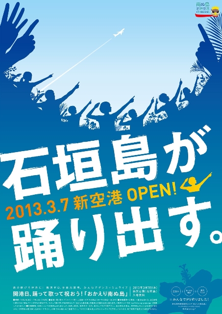 今日の担当は石垣市役所です 3月7日、島民の悲願であった新石垣空港が開港しました島民、そして八重山ファンみんなで、新空港PRソング「おかえり南ぬ島」を踊って歌って開港をお祝いするイベントを開催しました 小学生から大人まで総勢120名のブラスバンド隊、80名の三線隊が集まり、音出しリハーサルがスタート。このイベントは「観客ゼロ、全員出演者。」というコンセプトのイベントなので、一般の参加者の皆さんも、今日は観客ではなく踊り隊の出演者として、お揃いの衣装を身にまとい踊りの練習をはじめていました。 「今回はふつうのライブイベントではありません。全員が出演者です。」というアナウンスの後、振付けを担当するMIKIKO先生(Perfumeの振付を担当されている振付家)が登場。ブラスバンドと三線の生演奏に乗せて、踊りの練習がスタート。フィナーレはビギやま商店に夏川りみさんを加え、会場に集まった5000人みんなで「おかえり南ぬ島」を歌って踊ってお祝いすることになりました。 会場は、後にも先にもなかなか味わえないであろう一体感に包まれました。最後は、会場みんなで南ぬ島ポーズで記念撮影を撮影し、終演。世界中どこにもない、この島にしかできないお祝いになりましたその他の写真は新空港PR「石垣島が踊り出す。」のサイトで見られます 翌日8日は、石垣島・八重山ファンの代表として、ナインティナインの岡村隆史さんへの「新空港PR大使」の任命式がありました。パイロット姿に身を包み登場。かけつけた一般客約200名の歓声と拍手で迎えられました。中山義隆石垣市長より、「石垣市公認 新空港PR大使委嘱状」「PR大使タスキ」「新空港PR大使の名刺」を授与。島民のみんなから「おかえり南ぬ島」のダンスを岡村隆史さんに披露。見てもらう予定が、岡村さんもダンスに参加され、観客からは笑いと歓声がおこりました~ 岡村さんは「10数年から石垣島が大好きになりました。翌年にダイビングの免許を取り、それから毎年石垣島にきています。石垣島の人の温かさも大好きです。ですから、市公認の大使という肩書をいただき大変光栄です。ぜひ、石垣島で奥さんも見つけ、番組のロケにもたくさんきて、石垣をPRしていきたいと思っています。」とおっしゃってました!!どんどんPRよろしくお願いしま~す!!!その他の写真は新空港PR「石垣島が踊り出す。」のサイトで見られます