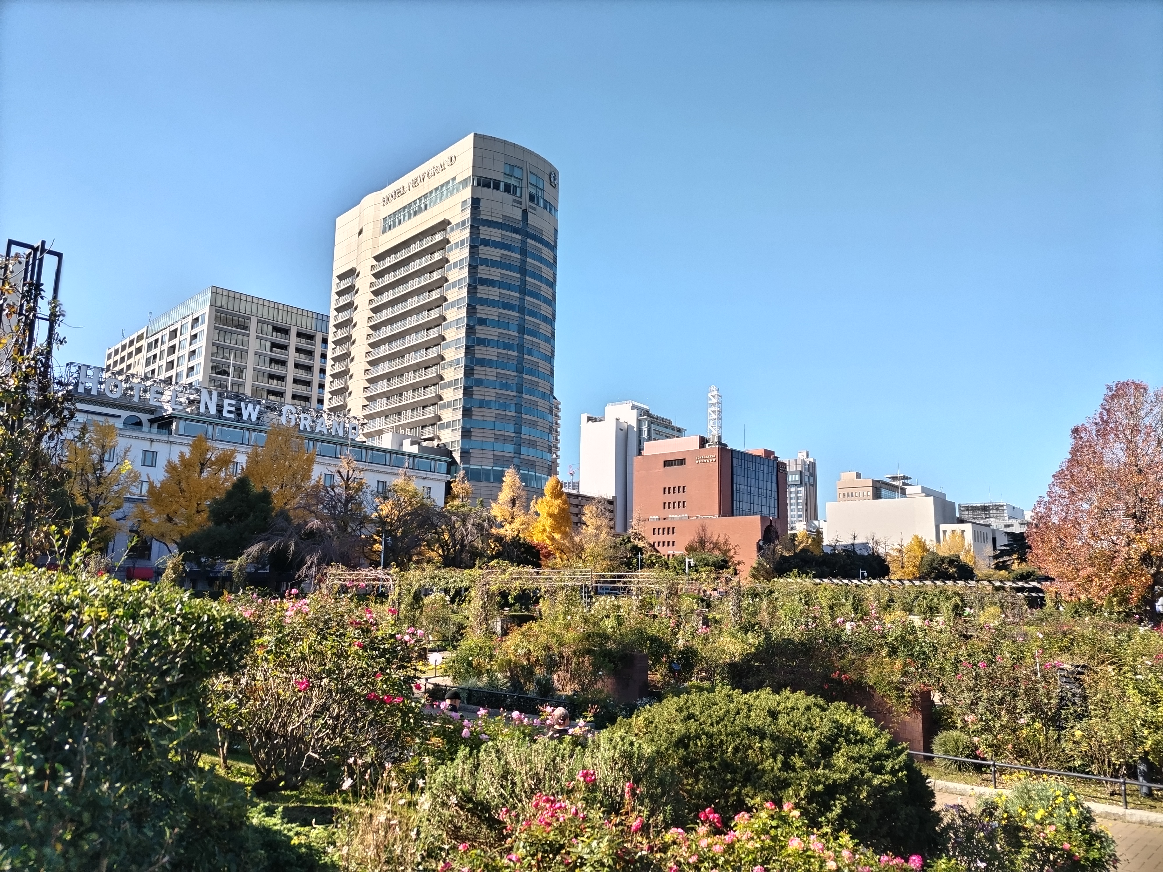 公園内のバラ園よりニューグランドホテルを望む