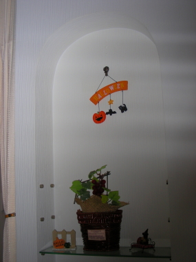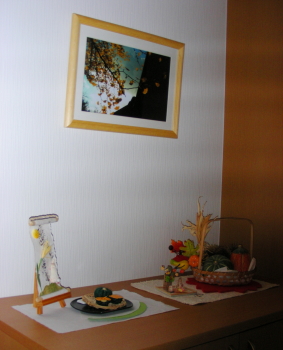 風は収まったけどしとしと細かい雨☂そして何よりこの暗さ。午前中でもまるで夕方暗くて寒くてその上、雨で今日は何だかちょっとブルー 何だかなー(--,)っと ふと外を見たらあ、スズメ。。お 入るか?入ってしばらく出て来ず出てきたらエサをくわえたまま足にも名残りが(笑)そんな他愛もないことで癒されております(^_^.) なおハトさんも来ております^^; ▲ 和室の衝立を 「秋」に衣替え