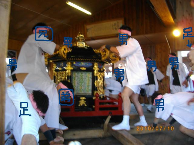 7月の思い出記録を綴ろう!なんていってるうちに8月も3分の1が経過なんかね、デジカメ(SDカード)からPCへ移して編集した画像なんですけど、サイズが大きすぎて使えないらしくサイズ変更できるのかと思いきや、そんなメニューも見あたらず・・・結局、デジカメで元の画像をサイズ変更してまたPCへ、というメンドクサイことになりました(ホントはもっと簡単な方法があるのか?)せっかく頑張って加工したのにまた最初からじゃん!(私のデジカメには十分な編集機能がない)・・・とかいいつつ結構楽しかったので、必要のないペイントまで結構しちゃってます(笑)えっと、まずは帰郷編です。毎年8月ではなく、7月に帰省します。なぜって?それは【祭】があるから!夏が苦手な私ですが、祭には心が踊りますいつもは脳内でぐっすり眠ってるアドレナリンちゃんも、お囃子の音(ね)を聴けば起きあがって踊りだすご様子(笑)まぁそれでも、出不精(デブショウ?)の雑踏嫌いですから、誰かに誘われないかぎり自ら出向くなんてことは、今までほとんどありませんでした。田舎のお祭りも、中学生時代に友達とワイワイ出歩いたのが一番楽しい思い出で、小学生の頃は子供みこしの参加が憂鬱だったし、高校の頃は文化祭と重なったり地域行事への興味も薄れ、東京へ来てからはなおのこと遠ざかっていました。私が郷里のお祭りのファンになったのは、兄と弟が神輿の担ぎ手になったのがキッカケでした。そこで初めて地元の【伝統の祭り】を観ました。18年間過ごしながら、一度も観たことがなかった【神事としての祭り】です。ホントはここで【祭り】を熱く語ろうかとも思ってたんですが(笑)ものすごく長くなりそうなのでやめましたとりあえず写真【宮出し】ペイント下手でごめんなさいいや、ここまで顔隠さなくってもいいとは思うんだけど(他のブログや動画検索したらバッチリ写ってましたし)、でも許可とってないので一応ね^^;宮出しは神社の神様を神輿にお乗せする神事です。写真だと分かりませんが、神輿をグルグルガタガタと激しく廻したり揺らしたりします。こちらの氏神様は荒ぶる神様としても有名ですので、神事も荒々しく、怪我人が出ることもあります。(写真では2人転んでますね)あ、もう娘のお迎えの時間なのでこのへんで・・・。(いつになったら書き終わるんだろ。笑)