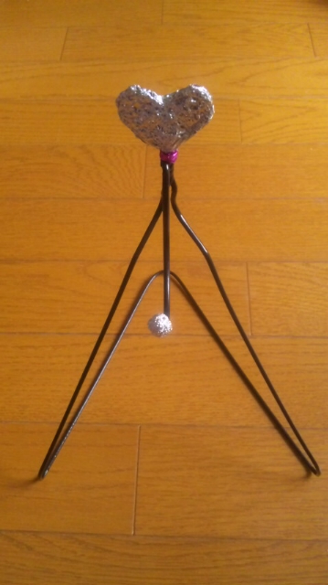 今日はオフです^^ 娘を保育園へ送り出し、溜まった家事を一気に片づけよう!と意気込んでおりましたが、ついついテレビをつけてしまいました(汗)そしたら「PON!」で「針金ハンガーでバナナホルダー」ってのがやってたので早速レッツトライ♪←こーゆうことは早いんだな(-_-)前から買うのを迷ってたバナナホルダー。105円(笑)安くたって我が家にとっては贅沢品!家にあるもので作れるんなら大歓迎☆例の如く衝動性に任せて作ったので、製作途中の写メはありません。えっと作り方は1、ハンガーの左右を握って手前に折り曲げる。 2、ハンガーの掛ける部分を反らす。(前後どちらに反らすかよく見てなかったけど、私は手前に反らしました。)3、形を整える。以上、簡単楽チンです。私が使ったハンガーは針金の先が尖ってたので、アルミホイルで保護しました。(ビニールテープは行方不明で使えなかった。)ハートの形にしてピンクの針金リボン(?)で留めてみました~。相変わらず完成度は低いけど、まぁいいんでないかい?ゴミにならない事を祈る!バナナを掛けた写真撮りたかったのに、バナナ1本しかなくて無理だった~。代わりに娘のブレスレットを掛けて撮影☆ストラップとか鍵を掛けてもいいかもね。(←ADHD傾向の人には向かないが。)さて、そろそろ洗濯干すかな。もう2時だよっ(>_<)