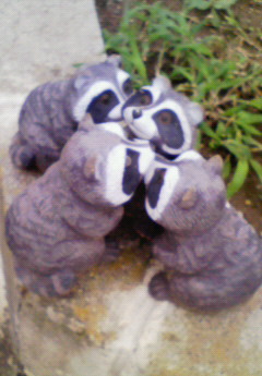 これは、ご近所の会社前に置いてあるアライグマ(?)の置物なんです。毎日4匹の配置が変わっています。一匹づつ花壇の周りに配置されたり、二匹ずつがペアになっていたり、一匹だけが仲間から外れていたり・・・誰が日々変えてるか分からないんですけどね・・・小学生かな?高校生の女の子かしら? 良いのは・・一匹も無くならないこと。先日はこうなっていました。で、車から降りて撮りました。この配置は初めてなんかこう、【和】を感じて、私の心も和んだ訳です。また一週間ですね!梅雨も終盤・・・頑張って行きましょう~!!