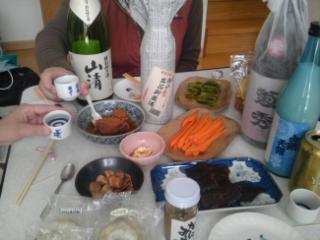 昨日は、友人のご実家のリフォームが完了し、お約束の、中を見せて頂く日となりました。「そのあと、飲みますか~」『天気が悪いから~】「はぁ~?天気と呑みとはどういう関係がありますの」お酒とは切っても切れない【M会常任役員3人組み】は、即!運も良く!≪持ち寄り昼のみ≫決行となりました先にお家を見せて頂き、驚きの連続。。。外観より、中は随分広く、ひとつひとつの空間がたっぷりと落ち着き、とても良いに仕上がっていました。方向音痴の私は、平面図を書きなさい!という宿題を出されたなら~~~、お手上げですでもね!?鬼ごっこなんてやったら、最高ですよ姐さんがでしょうが・・・・リフォームって良いです!!!!乾杯から飲みもお喋りも一気一気で、途中休憩を挟んだのは私のみ・・正味4時間の楽しい内覧会&飲み会でした。あまゆみ姐さん、有難う!S姐さん、ナマコ?の卵巣?を、ヒレみたいな形に伸ばしたという、名前は<OOO?>と言う珍味、相当お高いというのに、美味しく頂きました。ありがとう!帰宅後、雪掻きをしましたら、酔いは一気に醒め。。。。。薪の山を見ながら、、、、、大量の薪(風呂用。なにもこんなに集めなくてもねぇ~!生きているうちに焚き切れますの~?)が不要になったら、薪ストーブを入れようそうでもしなければ、この薪の山は片付かないわぁ~自分の好きな様にリフォームできたらいいわねぇ~そんな夢を思い描きました。さ~て、次は何処で新年会を?ちょっと待って夕食の後片付けをしていたら~~~、なんとなく頭がうっ、、、今頃、酔いが蘇えってくるなんて、、、、うっ!!体が無理でしょう~?と呟いていました