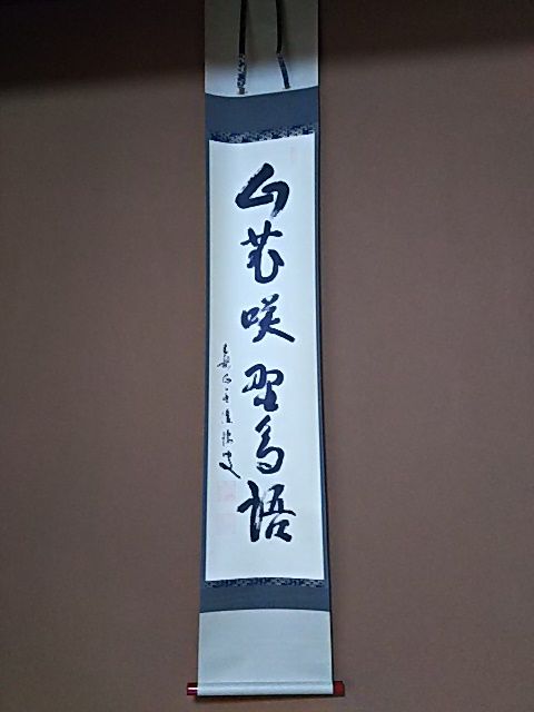 花の名前を覚えるの、酷く苦手でした。今も苦手かも。。(笑)3日前に開き始めた写真の花は《コブシ》で宜しいでしょうか?と、、、、どなたに聞いているのでしょ??(笑)昨日の茶室のお軸は【山花咲野鳥語】 ~~~~~~安静を言い渡されていた娘が、昨日、晴れてそれを解かれ、『みんなで焼き肉行くよ』と稽古中の私に連絡をよこしました。焼き肉を食べると子どもが生まれるとか??・・・コレって本当ですか??まあね、準備はほぼ完了したので、いつ生れてきてくれてもOKです友人が抹茶を飲みにきたいと言っていたので、あり合わせの道具で6畳間を茶室風にし、日々眺めていたのですが、そこはすっかり新生児室と化してしまいました(笑) ~~~~鬼の面とか、扇の飾りモノとか、信濃の国 や 小諸なる古城のほとり なんか?の、仕切りとして使っていた額は、片付けました小軸だけ残っていて、なにか適当な軸に替えたい気はする。宮本武蔵の 木にほととぎす じゃ味気ない。南無阿弥陀仏は絶対違う。酒 は場違い。中国の仏像 じゃ泣くでしょ??悶々(爆)