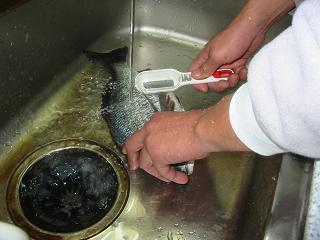 まず 最初に釣果報告!ダハハハハ!ボ-ズでした!でも 叔父さんに美味しい外道『チヌ』を貰ったデヘヘ 叔父さんはサバクのが苦手……………さて 行った所は『南紀南部』渡船は「わだま渡船」(お気に入りリンクしてるよ~)朝6時30分出航のった島は大島船着きのオイシイ所は他の組みにとられ表側の磯に……結局『グレ』は釣れず叔父さんが釣った『チヌ』2枚のみでしたこの日は朝から 粉雪南紀にも 雪が舞っている寒くて仕掛けが結べない泣きながら釣りをしたのは今回が初めて…………(言い訳)では タイトルどおり刺身を造りませう叔父さんに貰った『チヌ』をここへ~……まず鱗を落とします 鱗トリか包丁の裏または 大根等のヘタで鱗が飛び散るのがイヤならシンクに水をためて……(冷たいで~) ケツの穴から包丁入れてハラワタ出しますそして あっと言う間に 3枚おろしおっと 今日はうまいことできた どうよ キレイに骨だけ……… 皮も失敗しないように包丁を遊ばせないようしっかり握って この通り あとは 中骨のところ 落として刺身包丁で切っていく! はい!盛りつけ!男の料理は キャベツのみ………(大根のかつらむきでけヘンし(T_T))まあ 子供達 喜んで食べてたからコレで善し!!!!(^_^)v