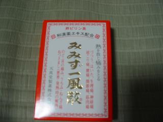 頭痛がひどかった (w_-; ウゥ・・ 薬 薬 く・す・り!なんじゃこれは? 『みみず一風散』“熱を散じ痛みをとる”と書いてある効能…づつう・はいた 生理痛・神経痛・~~~ねつさまし???づつう???ずつう????頭痛????昔の言い方かな?そんなんどっちでもかまへん!水!水!水!ゴクッ! ゴクッ! ごくっ!ウゲッ! まっずぅ~! (T△T)“良薬口苦し”そのまんまやん!仕事再開…………痛みは 治まらん………しかし 悪寒がする?効能のねつさましが効いているのか?でも 一番最後に書いてあったぞ?づつうは後回しか???昼休み 横になって寝たzzzzz起きると頭痛は治まっていたしかし 薬が効いたのか 寝たから治ったのか不明である??でも 相変わらず 悪寒は続く (TT▽TT)ダァーこの薬は 頓服やな?本日の人体実験結果『みみず一風散』は解熱剤である…………解散!