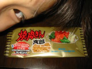 今日は S奈の遠足楽しかったらしいほんで お土産をもらった………『焼肉さん太郎』…………お前コレ おやつで買ってきたんちゃうんか!(-""-;)“うん でもな 辛くてねばねばしてきもち悪かってん”気持ち悪いもん オレにくれるンかい ヽ(`⌒´メ)ノしかも “おやじのん!!”って書きやがって (`^´)ブリブリたしかに ネバネバしとるなめてみた…… 子供にはチョット刺激があるか? ( ̄-  ̄ ) ンー噛んでみた………固い 食いちぎると言った方がいいのか? 。≠( ̄~ ̄ ) 名称 『魚介類乾燥品』ん? 魚介類乾燥品?肉入ってへんやンヶ“原材料の一部に大豆を含む”と書いてある“畑の肉”のことか? ほう オリジナルバスタオル タオルマフラ-が当たるンか20.000名か………でも このパッケ-ジそのまんまやったらややなぁ~ ほんで もうと-ちゃんはいらんわ………