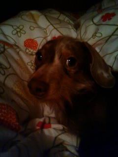土曜日のこと。外出したはいいけれど、頭がいたい・・・また風邪か~?と思いつつ、横になる。しばらくしてKの登場。夕飯どうしようとか、焼き鳥でもいく?とかそんな話をしていた。すると・・・いままで羊ヘッドをブルンブルンしたり、食べかけのガムをくちゃくちゃしたりして遊んでいたベルが、突然私の横にピッタリくっつきはじめた。ほっぺすりすり攻撃まで始まった。ん??おかしいね。いつもこんなことしてこないのにね。すると、今度は私のおなかの上に乗ってべったり離れない。もしかして、出かけちゃうかも的な雰囲気察して離れないんじゃない?という話になり。先週食べれなかった焼き鳥も我慢することになり。家でごはんにしました。彼が買い物に出かけると、その瞬間ベッドから出て、走り回ったり、羊ヘッドぶるんぶるんしたり。え・・・もしかして、とられる!!と思ってたのかな?買い物から彼が戻ると、そそくさとベッドに戻るのです。あまりにも分かりやすいこの行動そのうち、お出かけちないのねと思ったらしくお尻フリフリ台所へ行ったりベッドに来たりかわいいねぇ、まったく久しぶりのベルショット。暗闇ですが・・・