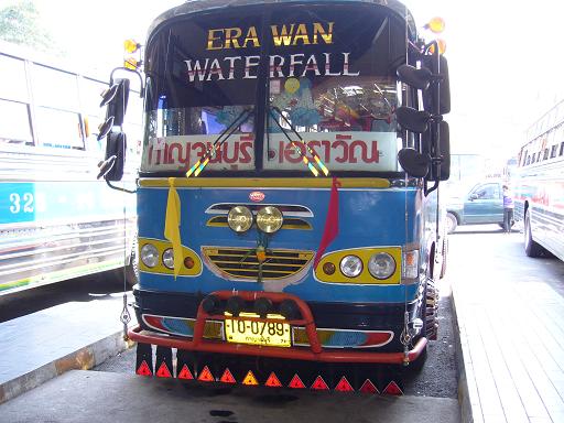 このバスに乗ってエラワンの滝へ。うーん。思いっきり書いてありますな。エラワンのたきぃっっっっってこれに揺られること1時間半。ついに到着、国立公園。「最終バスは4時だからな!」と運転手さん。もうすでにゆっくりしてる時間はない。そこからハイキングしつつ滝をめざす。えっさほっさ。こんな小さい橋も渡りやす。3段目まではかなり観光客&地元民が滝へ入っている。混みこみだ時間はないけれど、がんばって上まで目指す。すると、滝の規模は小さくなるものの、かなりプライベートな感じが漂ってくる。そして、ようやく到着。無人の6段目ここの水は、アイスブルー。コケが生えていないので、小魚が足の角質を食べにつついてくる。え、ちょっと痛い・・・。ちょっと誰もいないんで、ジャンプして、浮いてみました。ちょっと滝に打たれてくるわ!!てな感じで滝に生まれて初めて打たれてみました。なかなか顎が「あいあいあいあいあいーーーん」ってなるかと思うほどの水流で、恐るべし。自然の力。むむむ。ひとしきり遊んだところで、結果。最終バスをあと一歩のところで乗りはぐれ。とほほな雰囲気で、「もしかしたらバスがくるかもしれない」なーんて希望を持ちつつ、ベンチで座っていたら、ヨーロッパ系の男性2人組も、そわそわムードでこちらへやってきた。お仲間だったバスを逃して帰る手だてがないなら協力しようぜムードが盛り上がり、4人でとぼとぼ歩いていたら、地元民が山を降りたところまで連れて行ってくれ、(しんせつー)そこから、ピックアップトラックと交渉して、町まで連れて行ってもらったのでした。「おれ一人だったら、ヘルプ!!って言いながら叫んでヒッチハイクしてた。。。」と嘆く彼。そこからバンコク行きのバスにのり、ターミナル到着はもう夜の10時過ぎ。で、どうやって市内まで?白人グループがタクシー案内所で喧嘩をしている勤務が終わったっぽいバスの運転手さんに聞いてみる。すると、もうバスはもしかしたらないからタクシーしかないかもしれない。というあやふやな情報。ホテルのある地名を告げると、なんとそこまで別のバスが連れて行ってくれるとのことなんて親切(もちろん有料)他の乗客もいたのだが、私たちが降りるべきところでバスがちゃんと止まってくれて、さらに運転手さんが「ここだぞ!!」と教えてくれたしんせつーというわけで、そこからまた窓もドアもあけっぱのバスに乗り換えて、というか飛び乗って、長い長い1日が終わったのでした