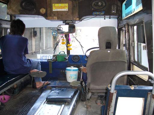 2日目は、国立公園のエラワンの滝へいく。っていう予定は、ずいぶん前から決まっていた。バスターミナルから2時間くらい。そこからさらに乗り換えて1時間半。という情報はゲットしていた。しかし・・・そのバスターミナルはどこなのか。2人とも「どっちかが調べるだろう」的なかんじで、調べていなかった。。。ガイドブックには、なんとホテル最寄駅から曜日特定で観光列車が出ていると書いてある。だけど・・・時間が間に合わない。フロントで、「南バスターミナルはどこ?」と聞いてみる。「あー、ここから1時間かかるわね、バスで。」うそ、1時間「で、そのバスって言うのは?」「40番バスでホテルの前から出てるわよ」というので急いでバスを探しに外へ出た。あった・・・真っ黒い、スーパーおんぼろの。さっそく乗り込む。左にいるのは料金集める人。仕事もビーサンで。いすの下に置いてあるのは、ラーメンどんぶりです。私たちがバスに乗ったとき、彼はお食事中でしたちなみに料金は1人40円未満。やす。。。エアコン付きは100円くらいになりますが、それでも安いですねどの窓も、いやどのドアも開けっぱなしで走行まるでハワイのスカイダイビングのときに、ヘリのドアが開けっぱなしで飛行していることに気づいた時と似たカルチャーショック排気ガスもんもん。バスが止まってるんだか、走ってるんだか分からない状態で乗り降りする「ね、ちょっとこれさ、本当に南バスターミナル行くのかね?」と一抹の不安。だって、「次は~ナニナニ駅ぃナニナニ駅ぃ」ってアナウンスはないし、バス停も、あるんだかないんだか分からない。よし、と思って後ろの席の女の子に聞いてみる。「Is this for south bus terminal?」彼女は困惑している。ヤバい、行かないんじゃ・・・「Ok, we want to go KANCHANABURI」と最終目的地を伝えてみる。すると、「おー、カンチャナブリー・・・」料金集めのお兄さんに、タイ語で何やら聞いてくれた。すると、うんうんとうなずいているそれは、イエスって意味だよねと願いつつ、バスに揺られる。すると、気付けば乗客はだれもいない。しばらくすると、料金集めのお兄さんがきて指をさした。そこには、たしかにたくさんのバスが停車している、バスターミナルさらにバスはUターンをして、近くまでいっておろしてくれた。しんせつーそして、バスターミナルでカンチャナブリまでのチケットを買い、コンビニで朝ごはんを買い、いざカンチャナブリへ。ちなみにコンビニで売っているお弁当、エビ玉弁当約110円なり。このハインツのケチャップももちろんタイ味のもの。チリソース。うまうまさて、ようやく到着したカンチャナブリ。最終目的地までのバスの発車まで時間がある。お昼ごはんを食べるためにブラブラを開始するのです。つづく。。。