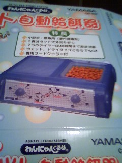 ちゃきーん買いました。自動給餌器。タイマー掛けておくと、その時間にふたが開いてエサが食べられますなんて便利もっと早く買えばよかったかもさっそく昨日の夜タイマーを掛けて、今朝蓋が開くように。夜、エサを入れていたら「え、ごはんくれるの」とウキウキのベル。床に置くと、匂いかぎまくり、がりがりしまくり、やっつけたい魂メラメラしばらくはお座りして、じ~~っとにらめっこいやいや、見ても何しても朝まで蓋はあきませんよそして今朝。シャキーンと蓋があいた。よしよし、タイマーOK。しかし、ベルはベッドの中でゴロゴロ。お水を飲みに出たベルは。。。気づきました。気づいちゃいました。一瞬目を疑ってました。フタがあいてる~~昨日、あれだけガリガリちても開かなかったのに~と言いながら、恐るおそる食べ始め、完食ベルのガリガリ攻撃にも負けず、タイマー作動も問題なし週末起こされる心配なしなんて便利。オートマティック餌マシーンこれでご飯の時間を気にせずいられます誰かにお願いする必要もありませんし