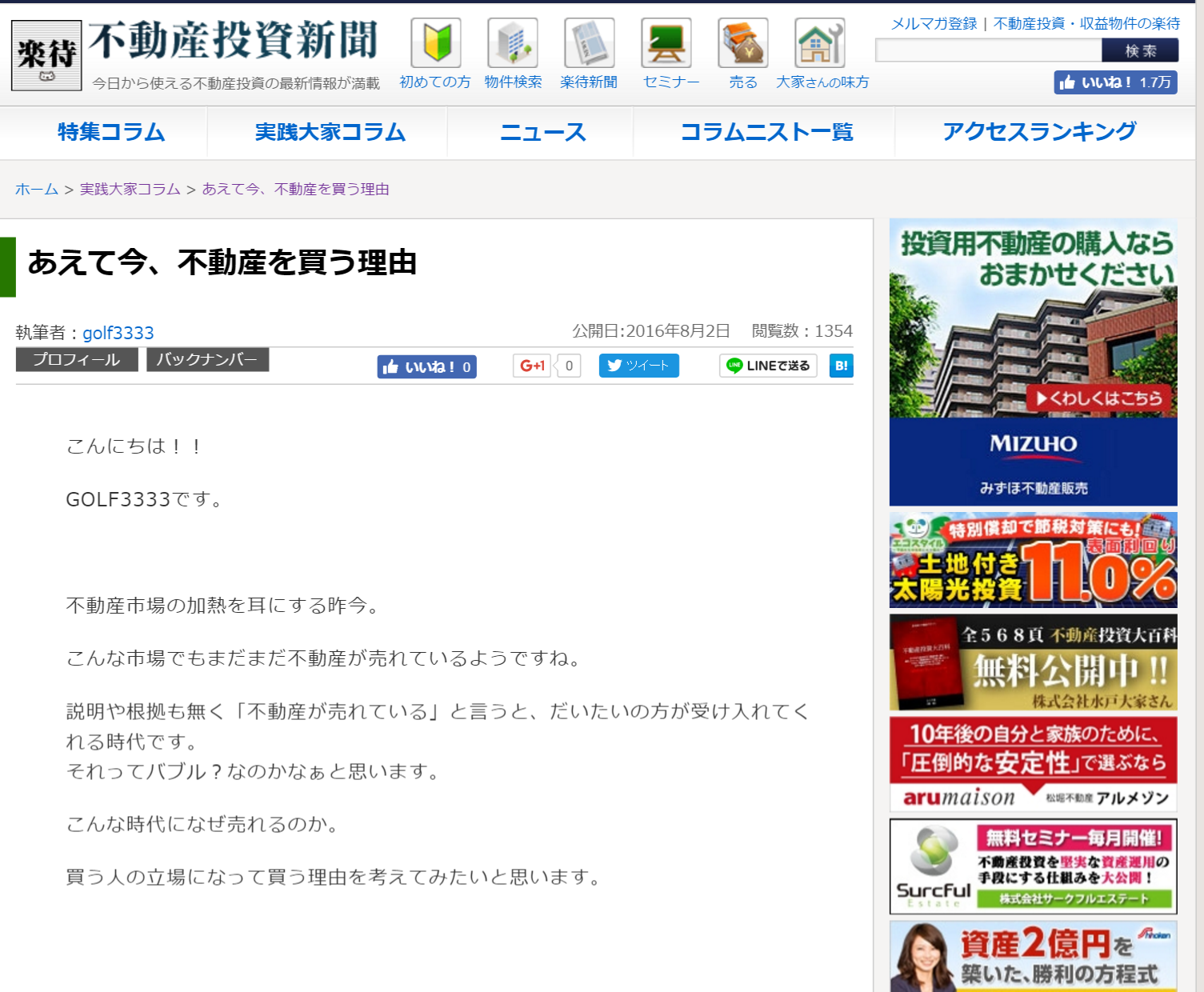 みなさんこんにちは。GOLF3333です。 日曜日の夜ですね。 今日は告知です。 楽待不動産新聞のコラム これから楽待不動産投資新聞にコラム・・・・・ 続きはこちらです