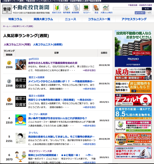こんにちは。GOLF3333です。最近は個人で運営しているブログにて情報を発信しています。GOLF3333のブログ人気記事を紹介しますのでクリックしてみてください。1.北海道の地盤の話し2.続・北海道の地盤3.GOLF3333、激動の2015年を振り返る4.杭は土地のキズになるのか?5.2棟目の77%戸建の購入した時の話6.1棟目の不動産を買ったときの話し改めて見ると初期の不動産が動いていた頃の記事が上位になっていました。最近の記事はリンクが多くてだめですね。(リンク記事は今回のランキングより除外しています。)