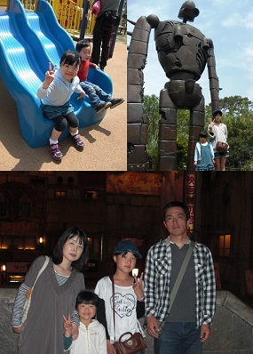 今日は前々から計画してた「三鷹ジブリの森美術館」に行ってきました。昼の12時からの入場だったんで、朝は8時過ぎにボチボチ出掛けました。到着までの推定時間が約2時間半で、8時でも早いかな~~とも思ったんですが、前もって調べた情報だと、土日は美術館の周りの駐車場がすぐに満杯になってしまって、それを探すのに苦労する・・とか書いてあったんで、早めの出発にしました。でも、でも、実際に現地に着いて駐車場を探し始めると・・どこかのブログにも書いてあったすぐ近くの青空駐車場が空いてて、入場案内のおばさんに誘導されてすぐに駐車する事が出来ました!ただ到着したのが10時半頃で、入場まで1時間半ほど余ってしまいました・・・。(これは嬉しい誤算)そこで、ジブリの森も入ってる井の頭公園内の子供達の遊具広場でしばらく時間を潰し、食事も取って入場する事にしました。ナナには少し幼い遊具ばかりだったので、ナナとママとバーバは井の頭公園内を散策する事に。ユメは自分と遊具で思いっきり遊びました。で、11時過ぎに食事も取って、いよいよ美術館に!もっと並ぶかな??って思ってたんですが、すぐに入る事が出来ました。ただ館内は大勢の人人人。美術館と銘打っているように、展示物を入場者が眺めていくっていうスタイルがゆえに、展示物の前には必ず何人か人がいて、そこで人の流れが滞留しちゃうんです・・まぁ、でも、一つ一つの展示物を興味深くジックリ見れたんで自分は大満足。子供達もいろんな仕掛けのいろんな展示物を鑑賞出来て(ねこバスも乗れたし、メイとねこバスの映画も見れたし)楽しかったみたいです。(ママやバーバは映画の内容を知らないものもあったみたいで・・・今一つ二つ・・だったかもしれませんが)子供達が楽しめたんで、この遠出は成功でしょう!2時間ほど館内を楽しんで、帰ることにしました。ただ、帰路に着いたのが3時半頃で早かったんで、急遽、計画変更して横浜のラーメン博物館に行く事にしました。最初は帰っちゃおうとも考えたんですが、こういう時でないと行く事はないな~~って考えなおして行くことにしました。で、この選択が正解!!!ラーメン博物館なんで、美味しいラーメンをタラフク食えたのは当然ですが、館内でジャグリングやスポーツスタッキングの方々のショーがあって、それも見ることができ思わぬ収穫でした。(2組とも非常に上手で楽しいショーでした。)7時半頃に食事も終わって、やっと家路に着き、家に着いたのが9時半。自分は運転とかで思った以上に疲れましたが、子供達も家族も十分楽しめたみたいで良かったです!さぁ今度はどこ行こう???(^^)