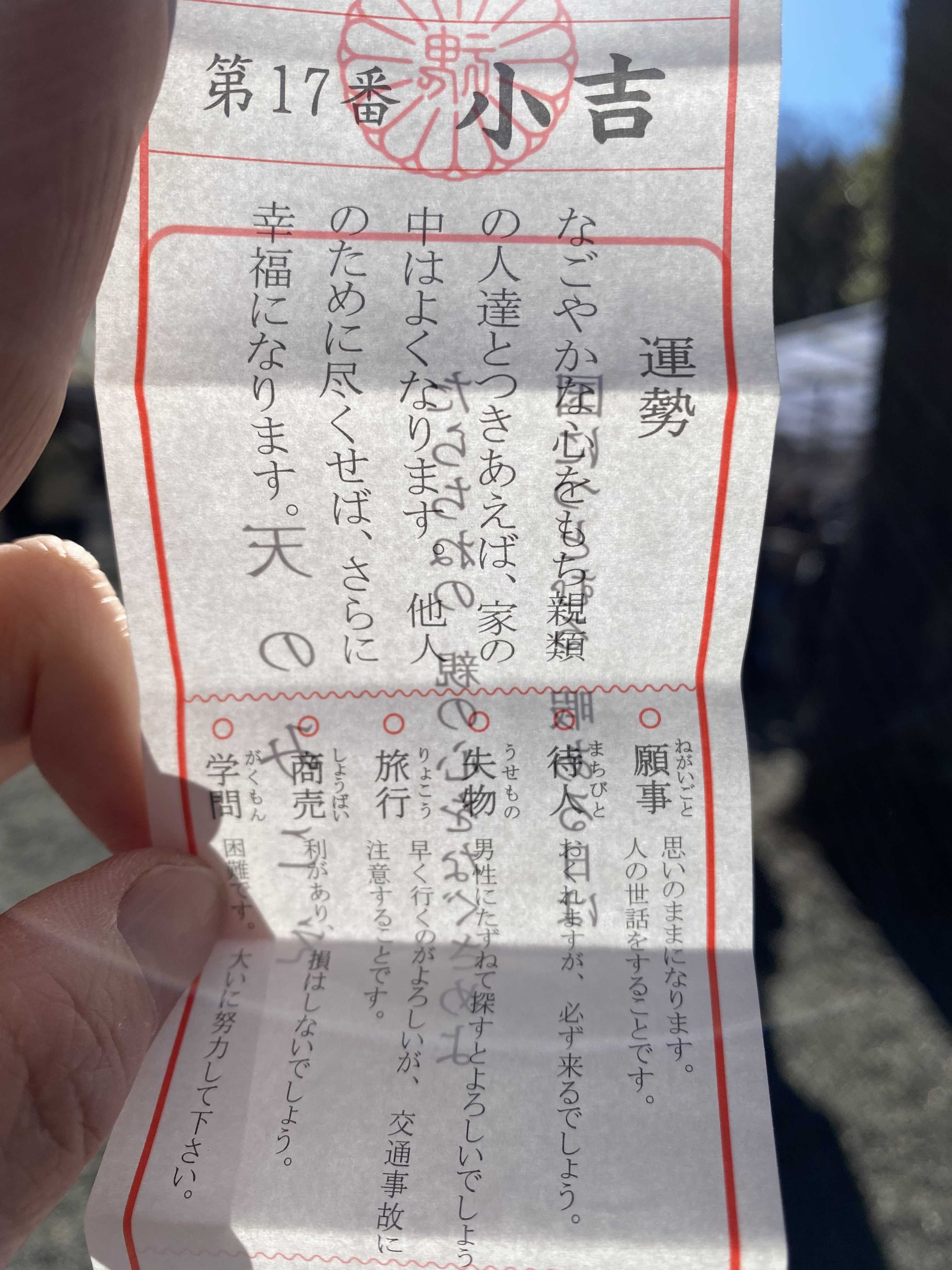 2022年新年が、明けました。その前日の大晦日。年越し蕎麦など整えた食卓で、父が、年末の挨拶とばかりに改まって言った。「今年も大変お世話になりました。来年もお互い助け合って、どうかよろしくお願いします」父は耳が聞こえないので、それに対して(聞こえないように、冗談半分、いや本気9割8分で)「嫌です」と言った鬼ムスメは、私です👹そして元旦のおみくじが、こちら。和やかな気持ちで親類とつきあう…他人のために尽くす、人の世話をすることで、あなたの願いは叶い幸福になる…とのこと😅 極めつけに、天のみこえには「親」の言葉がはっきりと。「嫌です」と言った私の言葉が神様に聞こえちゃったのか?😅この一年も親のお世話様係は続行するのだろうと覚悟を決めました。しかしこれは親が今年も健在でいてくれるということか、これ有り難きことなり。(と考えることにする)********拙い我がブログを読んでくださっている皆さま、いつもありがとうございます。どのようなお立場の方が読んでくださっているのだろう…と思いながら、どなたかの目に留まり、何らかの思いを持っていただけるであろうことは、私はひとりじゃない、と思えて心強い存在です。今年もよろしくお願いいたします。