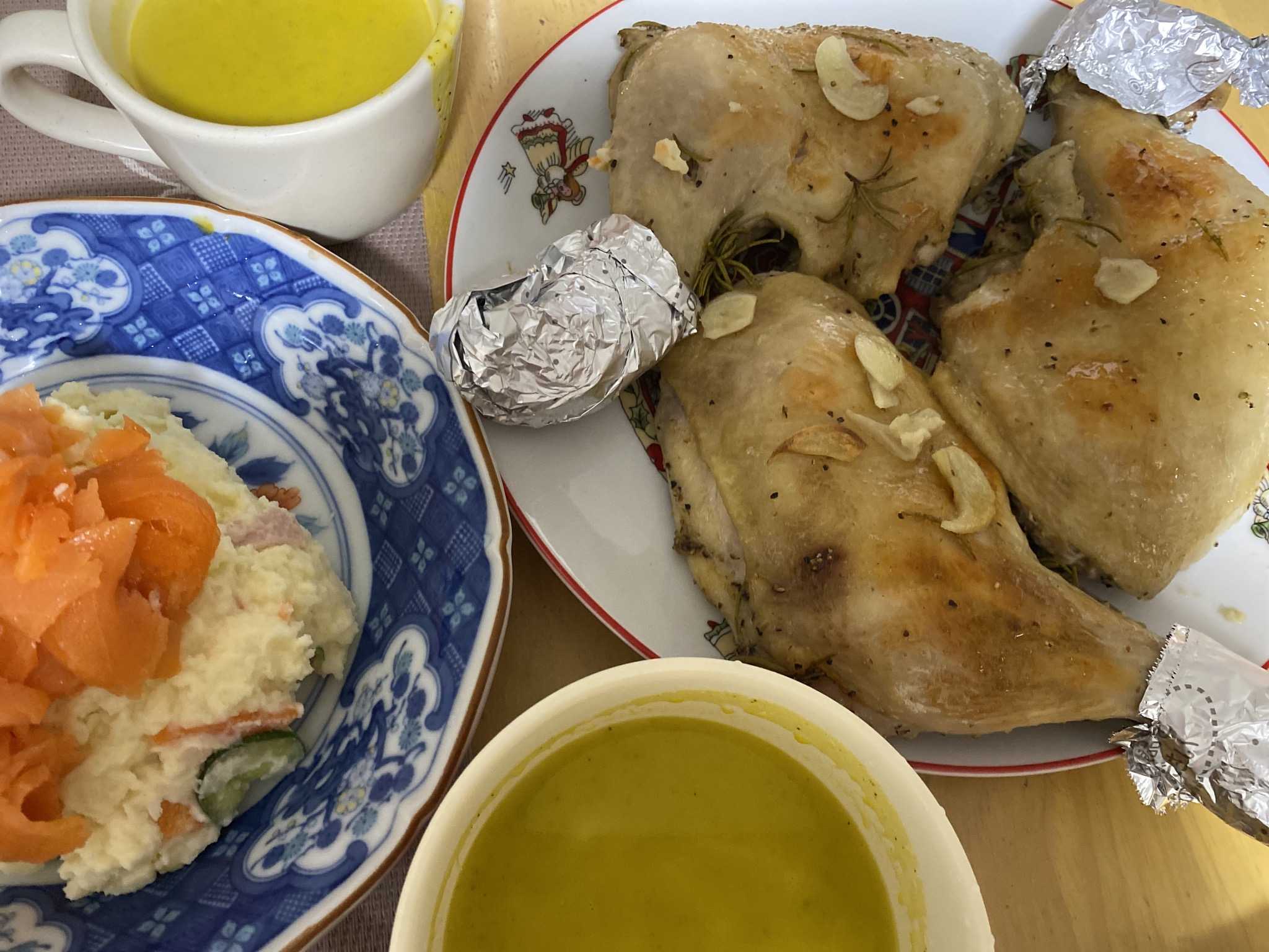 Xmas。今年も無事に、チキンを3本、焼くことができました。父に、3本のうち「どれ食べる?」と聞くと、一番大きなチキンレッグを指差す。😆このままでは食べられないので、チキンはあっという間に無残な姿に。それでも、好物の Xmasチキン、今年も食べられてよかったね。そうボードに書いて見せると、「うん」と頷いた。ナイフで切って小分けにする間、(あぁ私のチキンがさめる〜)とつい思っていたら、「すまんな」と父。はいはい、いいですよ。父93歳。母88歳。今年も人数分、チキンを焼けたのは、なんと幸せなことか。ーー何があっても、最後はいつも、この気持ち。こうしていられることは、幸せなのだ。幸せなのだ。自分に言い含めていることもあるけれど。ホントのことだとしみじみ思う。きょうの鬼ムスメは、ちょっぴり素直だったりする🤣さっきは、チキンを切る横から手を出して、父、大きな一切れを口に入れて、喉に詰まりかけ、慌てた…。「少しずつ口に入れて、よくかんで、少しずつ飲みこんで!」そう書いて見せて、目の前で「見守る」。はぁぁ。今年はこんな Xmas。…はい、幸せです。↓ 私は明日は友だち家でささやかな Xmasパーティなので、きょうは飲まないでおこうと思ったら、父が「シャンパンないのか」と…😅 シャンパンないけど、買い置きのスパークリングを開けました。介護ケアラーの皆さまも、介護されているおじいちゃん、おばあちゃんも。皆さま、Merry Xmas✨