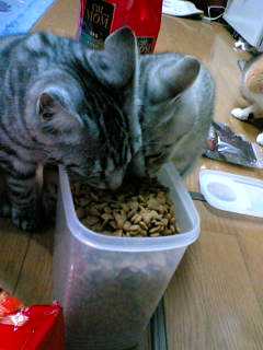 おふくろちゃんが容器に移したカリカリをその場で食ってまいた。