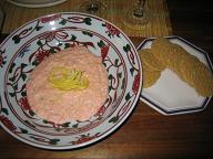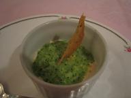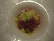 とってもよかったので、友達を誘ってまたおじゃましました。今日は何からかなあ~? 「まぐろの山かけ」でしたって、居酒屋のメニューみたいですが、さすがにぜんぜん違います。上に液体窒素の何でしたっけ? かかってます。でもやっぱりご飯にかけたい気持ちにはなりますね(笑)。 そして2品目は、「かきのフリット」。衣自体に味がしっかりついていて、かきもふるっふるですね。うーん、おいしい。 そして、名物のお肉のグリルミストです。牛のステーキと、大感激だったレバーと蝦夷鹿です。やっぱりレバーがおいしい! 友達たちも「こんなレバーは初めて」と言っておりました。 そして、大好きなサラダ。これもシンプルなのに本当にしみじみおいしいです。中ににんじんとかかぶとかごろごろ入ってます。野菜の味が濃くて、ドレッシングもおいしくて、ばりばりいけます。 そして、お肉の続き「子羊のグリル」、これもすばらしい。 そしてそして、これも大好きな「豆のペーストと青菜のくたくた煮」。これもいい味が出てるんですよねえ。 そして、今日一番感激したパスタ!「白子とねぎのパスタ」です! 白子とパスタなんて夢のような組み合わせ。そして「これでもか」というくらいねぎが入っていて、ぴり辛なのです。だから味がしまっているのでしょうね。白子が甘くてとろとろですよ。(涙) 今日デザートに選んだのは「りんごのパルフェ」。中にりんごの煮たのと、ジュースをあわ立てたようなものと、生クリームです。さわやかでおいしかった。ほかにかきのサバイヨーネというのも、今までにないおいしさでした。今日も大満足。コース6500円(税込み)というのは、本当にCP高いです。