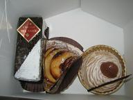 代官山から中目黒に移って初めてうかがいました。近くなってうれしかったのですが・・・ケーキを3つ買いました。おいしそうでしょ?まずは、チョコの店ですから期待の"ショコラ・ミルフィーユ"。パイ自体がチョコ生地というのがめずらしいですよね。でも、これがなんというか、重すぎますね。パイに軽さがなく、クリームもあまりにもったりして、この私がケーキを1つ食べ切れなかったのです! どんなしつこい甘いケーキでも食べきってきたのに・・・(泣)。残念でした。なぜ、こうなっちゃうの?でも、すぐに気を取り直して、りんごのタルトにかかりました。これはさっぱりかな、と思ったら・・・重いよ~。りんごはぱさぱさで、うまみが残ってないし、タルトも硬くて、もっさりしてる。アーモンドパウダーが入った生地の部分もなんだか、きれがない。「おいしい!」って感じじゃないんだよねえ。うーん。前はもう少しおいしかった気がするんだけど。ほかにおいしいケーキを食べ過ぎたかなあ・・・、まさかね。残るモンブランは明日にしよう。でもちょっと期待できない雰囲気。