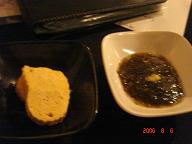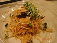 なぜか、今週2回目の神楽坂。今回は初めてのお店。勝沼のワイナリーがやっているお店だそうです。生ハムの盛り合わせを食べた後。 たこと根セロリのサラダ。この根セロリというのが、セロリとはまったくちがって、くさくなく、歯ごたえがちょっとあって、なんともおいしいものでした。ぷりぷりたことナイスマッチ。 生うにとコンソメのジュレと生牡蠣。ジュレは、夏にぴったりのさわやかな味。でもしっかりした味付けでした。夏の牡蠣というのもおつですね。 生うにのトマトクリームスパとあなごのテリーヌ。生うにの量がちょっと少なくて寂しかったです。あなごのテリーヌは1時間くらい待って頼んだもの。待ったかいがありました。あなごのカツみたいなんです。パン粉をつけて焼いてあって、おいしいこと。これはオリジナルですね。 お茶のブラマンジェと桃のシブースト。本当にお茶の味でした。シブーストは、アイス?ワインも1本とって、3人で2万円ほど。ふむ。星は3.5です。☆☆☆0.5
