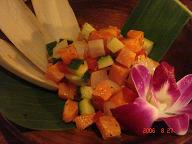 目黒川沿いにできたハワイ料理のお店。オープンエアにして、川沿いの緑をながめながらの食事は気分が出ます。今日はジモティー6人で、暑気払い。でも、払う必要がないほど、すごしやすくなりましたね。 サーモンタルタルとアヒポキ。アヒとはマグロのことです。魚が新鮮で、味もいいです。 チキンサラダとラウラウポーク。サラダのドレッシングは、ちょっと甘辛で、ハワイっぽいです。ラウラウというのは、やしの葉で包んで蒸したもの。驚くほどやわらかくて、いい味が出ます。 スパイシーシュリンプとオニオンフライ。 オックステールフォーとロコモコ。ロコモコとはハンバーグライスです。フォーは、いい出汁が出てますが、ロコモコはちょっと学食みたいな味ですね。 デザート3種です。パイナップルチーズケーキとフラパイというアイスクリームケーキと、3種類のクリームブリュレ。私の頼んだオレオとパイナップルのチーズケーキは、苦味と甘みとチーズがとってもよく合ってました。けっこうみんなそれぞれに飲んで、1人4000円! 気に入っちゃいました。星は、3.5です。☆☆☆0.5。