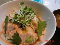 すごい久々に渋谷でお昼時。パルコの前の交差点あたりをうろうろしていたら、新しいカフェを発見。和風のランチもいいかと思って入ってみました。ランチメニューは、7,8種類のおかずから3つ選んで、玄米ご飯とお味噌汁と組み合わせられるもの(800円)と、明太アボガドマグロ丼と、もうひとつ丼メニュー。こちらは840円。明太アボガドマグロ丼を選択。 まあ、いいんですが、マグロの筋が多かったかな。飲み物も200円でつけられるし、近くにあればいいかもです。やっぱり世は健康志向なのね。