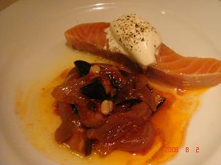 中目黒のイタリアン「アゴスティーニ」、安くておいしくていいのですが、サービスの人がちょっと愛想がなくて、というのが残念でしたが、久しぶりにうかがったら、人が変わっていました。3700円のプリフィクスコース。前菜、パスタ、メインが選べます。 前菜のスモークサーモンと、なすのカポナータ。サーモンにたっぷりのクリーム、それになすが入ったカポナータ。至福の味です。 もうひとつの前菜は、牛肉のマリネとピクルス。マリネもピクルスも酢がきいてます。夏にはやっぱりいいですね。 パスタの1皿目は、ゴルゴンゾーラとくるみのリゾット。濃厚です。大好きな味です。 2皿目は、オレキエッテ、ほたてとブロッコリーソース。こちらは、唐辛子が効いてます。 メインの魚。真鯛のポワレ、トマトとピーマンのソース。ぱりぱりの皮に、ふわっとした身。先日「コントン」の真鯛もおいしかったけど、これもおいしい。トマトと黄色ピーマンのソースもあいます。 そして、お肉の子羊ロースト。これも、ふっくらうまみたっぷりです。そういえば、最近、真鯛と子羊をよく食べてますね。好きなんですね・・・でも、さすがにおなかがいっぱい。3700円でこの内容は、すごすぎます。 デザートのパンナコッタ。上にメープルシロップとナッツをくだいたものがいっぱい乗ってます。ナッツのざくざくした食感とねっとりしたパンナコッタがいいコンビ。 そして、ここの名物、栗粉のプリン。かためのプリンが好きですね。デザートは500円、コーヒーは400円で、今日はお酒を1杯ずつだけだったので、なんと、2人で10800円。申し訳ないような感じもします。次は、お酒をもう少し飲みますね。
