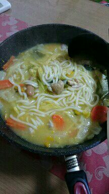 昨晩は寒くて寒くて。 ご飯も少ないしうどんにしました。 ちょうど、かぼちゃがあったのでほうとう鍋風にしました。 味噌の残りが少ないから今週は味噌汁一回ぐらいしか作れんな~。