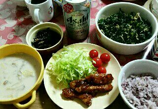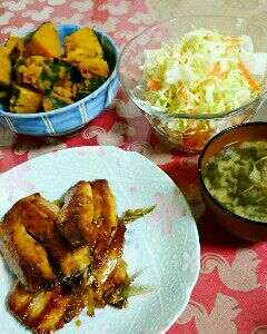 3月30日 イワシの蒲焼き かぼちゃの煮物 味噌汁 サラダ イワシの蒲焼き旦那は気に入ったらしい。わたしは苦手。 3月31日 蒸し鶏のサラダ 黒豆の煮物 いももち 味噌汁 雑穀米
